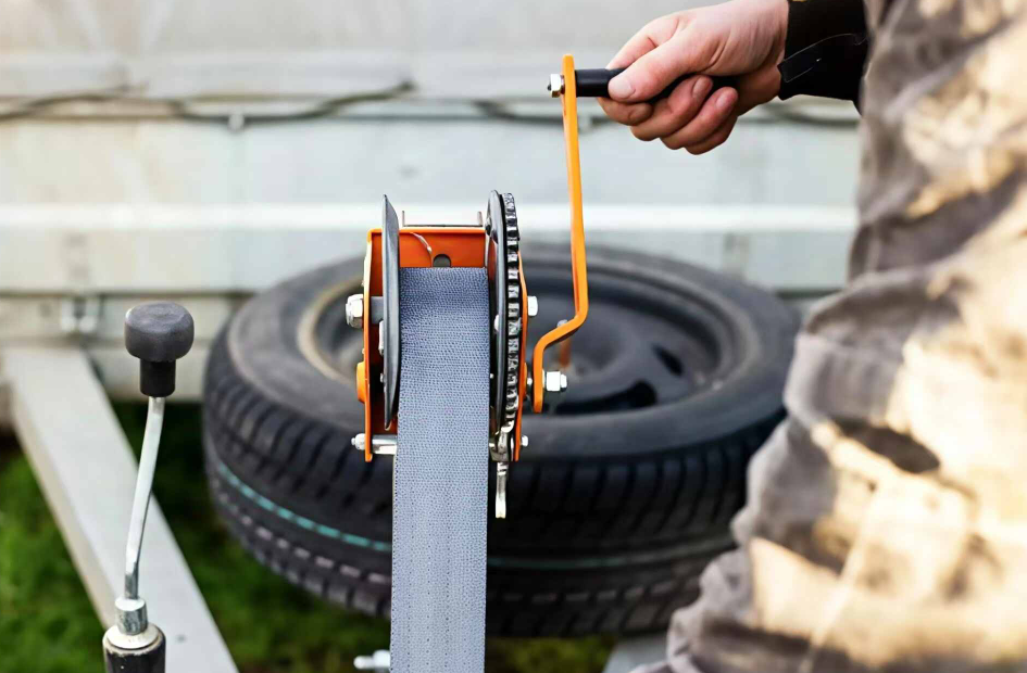مبدأ العمل: يتم تأمين حزام البوليستر مقاس 4 بوصات (قوة شد تصل إلى 20000 رطل) بسرعة خلال 30-60 ثانية باستخدام رافعة الونش الموجودة على المقطورة.